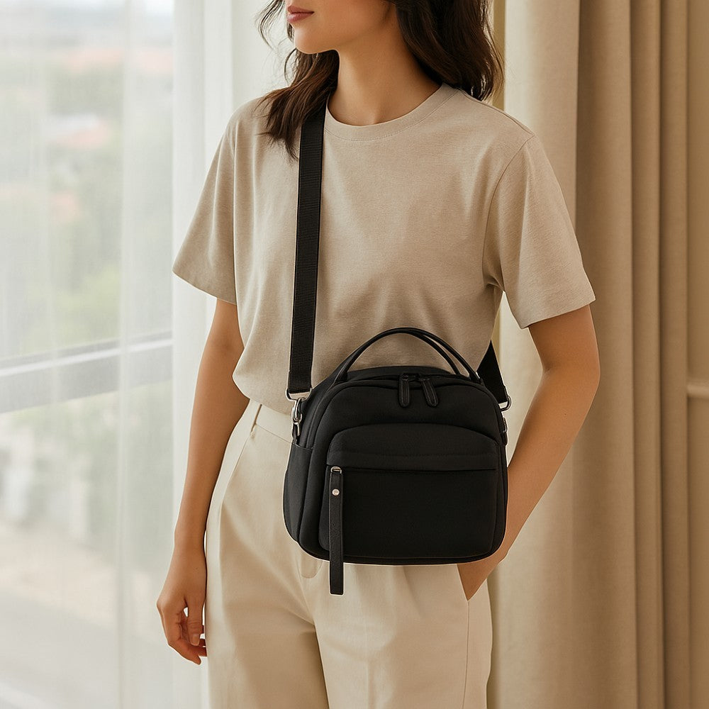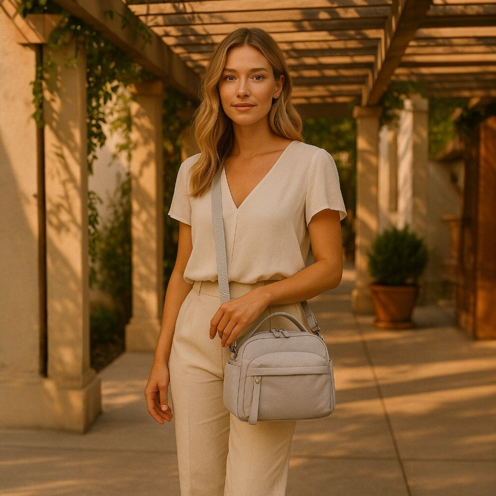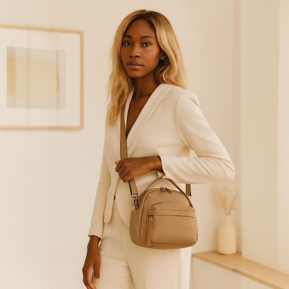 Med sina mjuka linjer och rundade form ger Lyona en chic touch till varje outfit. Lätt, mjuk vid beröring och vattenavvisande, håller den dina nödvändigheter organiserade..